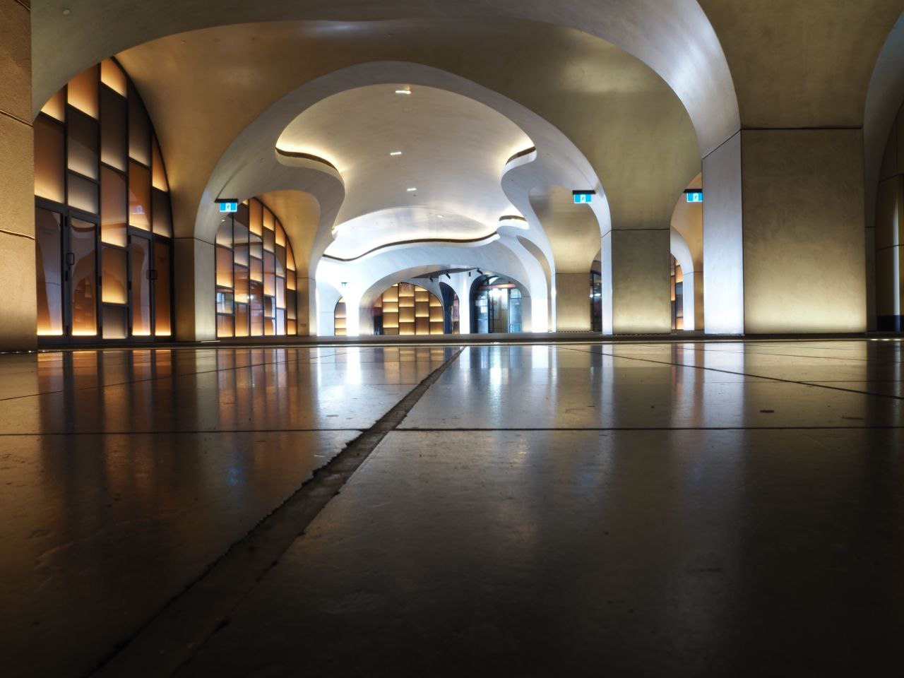 فوکوس از سطح زمین، که بافت و خطوط آن کاملاً واضح دیده میشود، شروع میشود و بهتدریج چشم را به سمت قوسهای معماری در انتهای راهرو هدایت میکند.